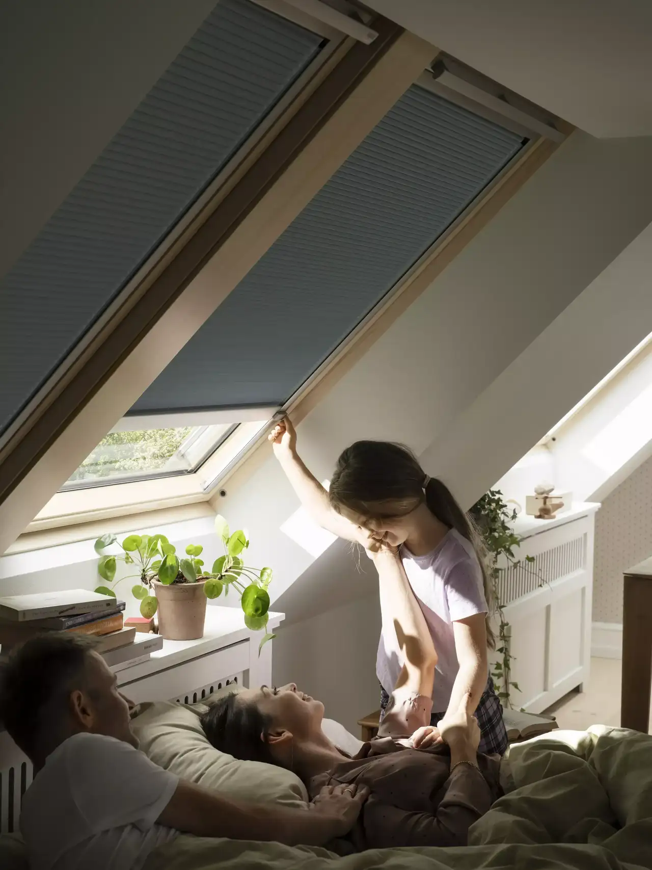 La serotonina, entre otras cosas, aumenta el impulso y mejora el estado de ánimo, pero inhibe la liberación de melatonina, la hormona del sueño que favorece el sueño. Y cuando está oscuro, aumenta la producción de melatonina. Por lo tanto, el dormitorio debe estar lo más oscuro posible, por ejemplo, con cortinas para ventanas de tejado, como la cortina plisada de máximo aislamiento o la cortina de oscurecimiento. Las persianas para ventanas de tejado garantizan un oscurecimiento eficaz de la habitación.