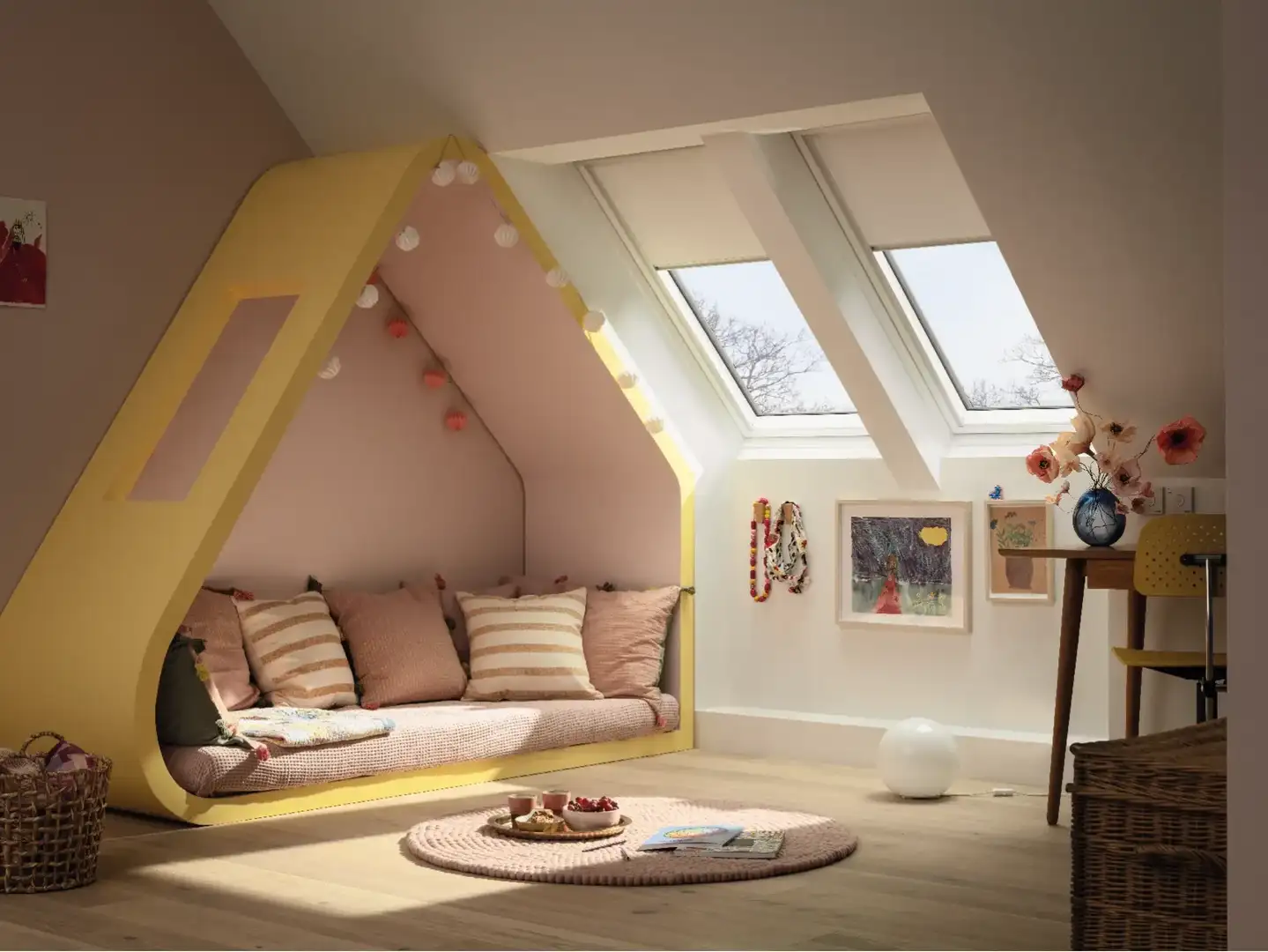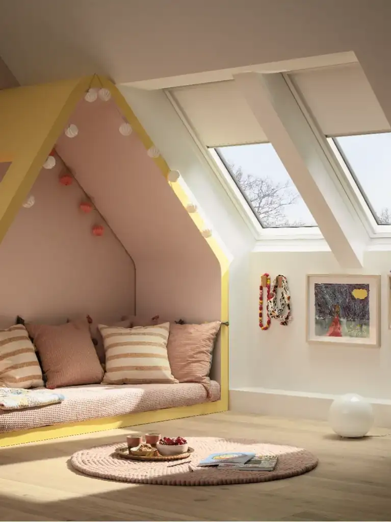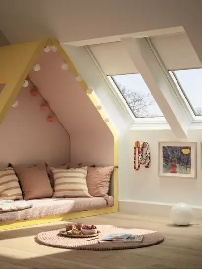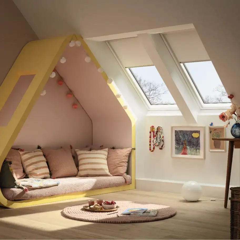 Las cortinas de oscurecimiento VELUX brindan excelentes vistas del exterior cuando no están en uso y garantizan una máxima oscuridad en cualquier momento del día.